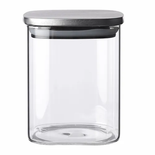 30 oz. Square Glass Storage Jars. Airtight Stainless Steel Wrapped Lids Included . Add a Stylish Element to Your Kitchen. Great Promo Item for Cookies and Candies. Recommended Hand Wash Only