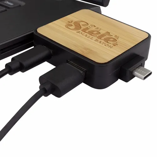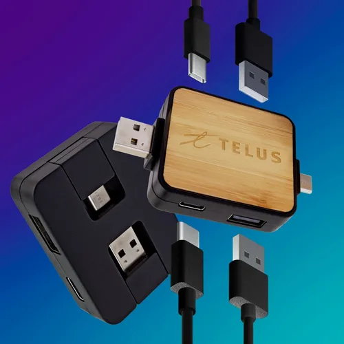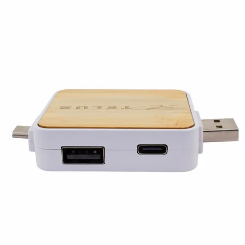 A compact and portable USB hub with two Type-C ports (USB-C) and two standard USB ports (USB-A). Made with recycled ABS (Acrylonitrile Butadiene Styrene).