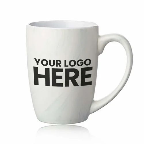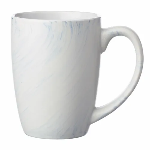 10 oz. Ceramic Mugs. Marble Glaze Finish. Smooth Glossy White Interior. Recommended Hand Wash Only