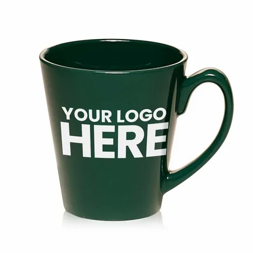 Latte Promotional Logo Coffee Mugs with a Unique Shape. Smooth Molded Ceramic Composite. Glossy Vibrant Color Exterior Finish. High Curved Grip for Easy Grab-n-Go Handling. Recommended Hand Wash Only
