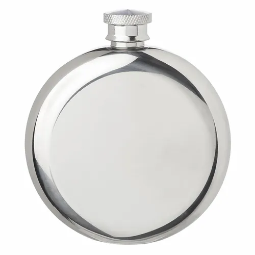 5oz. Stainless Steel Hip Flask. Round Shaped Single Wall Construction. Comes in Matte Black or a Mirror Silver Finish. Stainless Steel Screw-On Lid