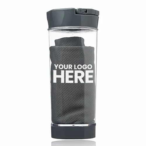 Sports Kit Cooling Towel with Bottle Holder. Clear Bottle Holders. Towel Color Matches the Lid Color of the Bottle. Phone Holder Available at the Bottom Part of the Bottle. Inserted Towel Measures 11.75” H x 31” L . Bottle Can Hold 11.83 oz or 350 ml of Liquid