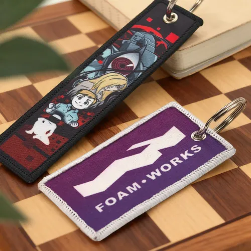 Here's the perfect keychain you are looking for. An Embroidered Patch on a keychain. The actual letters can be stitched in just about any color desired, Pick the colors and text that you want. Finished with Metal ring with eyelet and merrowed border. A maximum of 12 colors and you can choose the shapes that fit on your artwork.