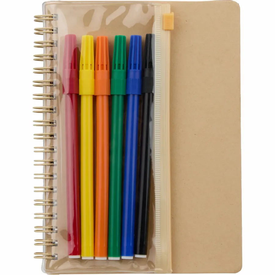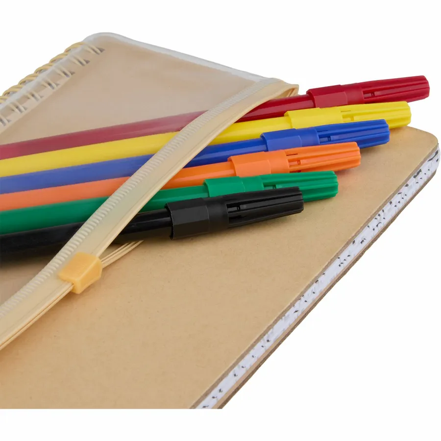 Unleash creativity with the 5 x 7 FSC Mix Doodle Notebook with Markers. It includes a spiral notebook with 60 sheets of FSC mix paper (lined and doodle pages) and 6 watercolor pens (black, red, yellow, green, blue, orange). The kraft cover is FSC mix and features a resealable transparent PVC pocket for storing the pens when not in use. Note: shelf life is 1 year. By choosing this notebook, you’re making a positive impact on the environment through a partnership with 1% For The Planet, as a portion of each sale supports environmental nonprofits.