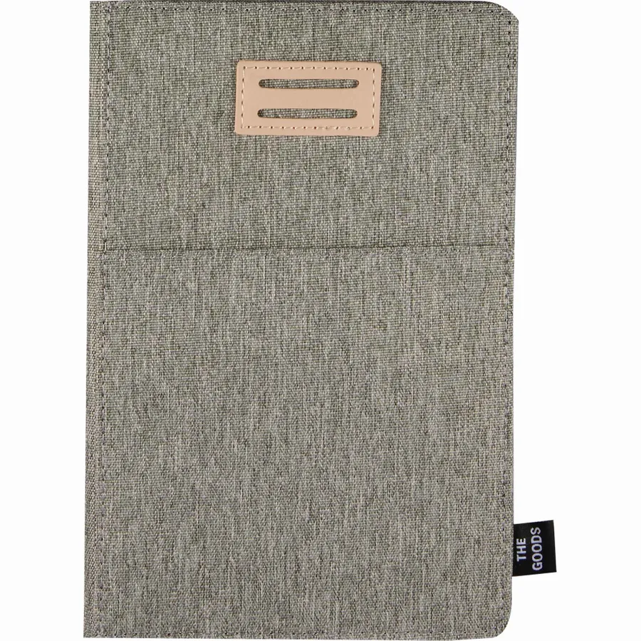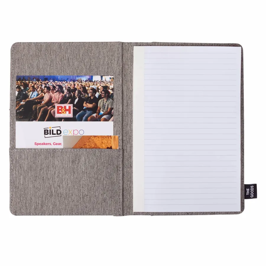 THE GOODS™ 5.5 x 8.5 Recycled Refillable Journal is a versatile choice for staying organized. Featuring a 100% recycled polyester cover, this journal includes practical pockets on the front and inside cover, perfect for storing business cards, your smartphone, pens, and more. With 50 sheets of recycled lined paper, it’s designed for eco-conscious users who value functionality. By choosing this journal, you’re making a positive impact on the environment through a partnership with 1% For The Planet, as a portion of each sale supports environmental nonprofits.