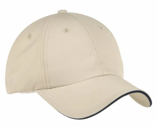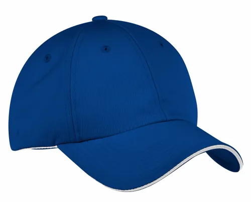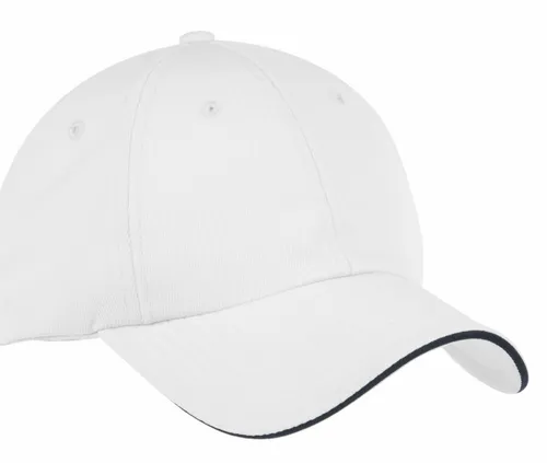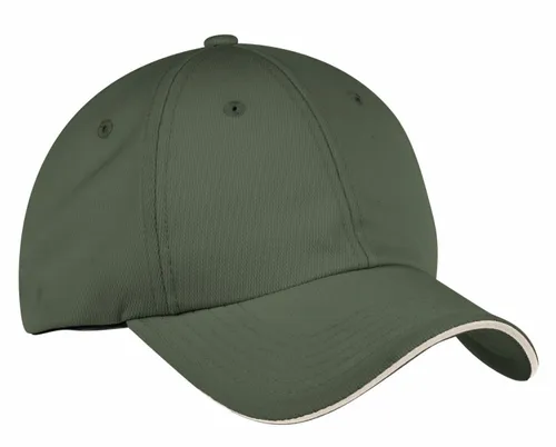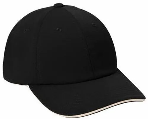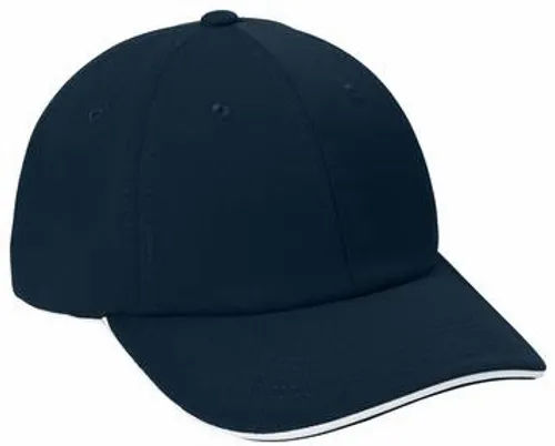 This cap features a moisture-wicking CoolMax sweatband. The sandwich bill adds character and is a great complement to any logo. | Fabric: 55/45 poly/polypropylene double knit Structure: Lightly structured Profile: Low Closure: Hook and loop